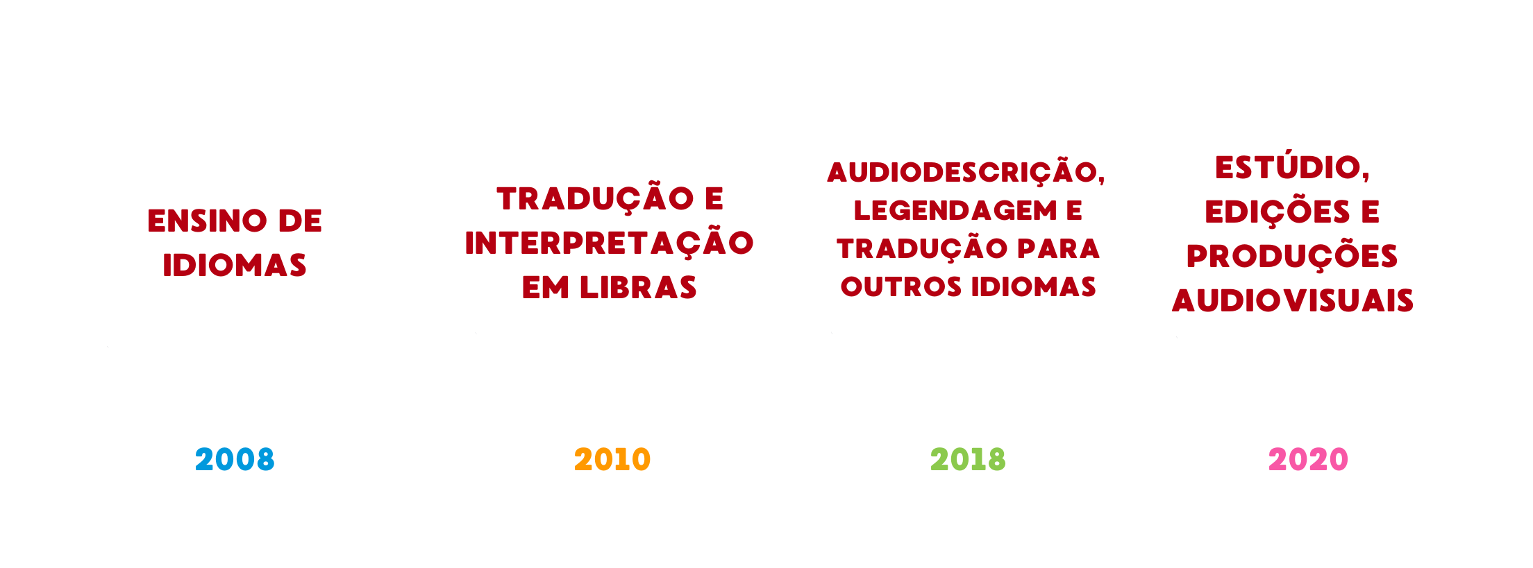 Tradução, Interpretação, Transcrição, Edição, Estúdio, Gravação, Legendagem, Audiodescrição, Revisão, Palestras, Organização de Eventos, Ensino, Consultoria e Assessoria inclusiva.